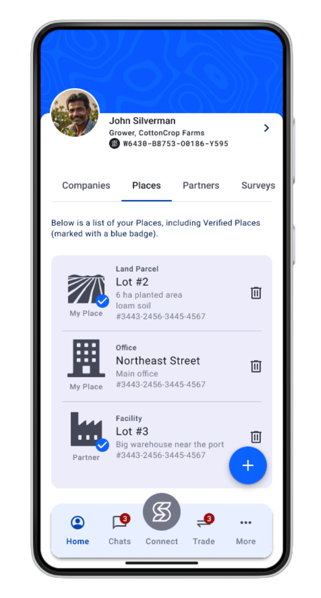 That’s why the Connect Platform ‘Places’ feature takes a different approach. We use a proprietary static map that includes only a geocode, address, and topographical overlay—nothing more. When you add a location in Connect, it’s assigned a unique Bluenumber, giving your data the same blockchain-level protections you have as an individual. That means full control, privacy, and security over your farm, facility, or office information—without surveillance or third-party access.